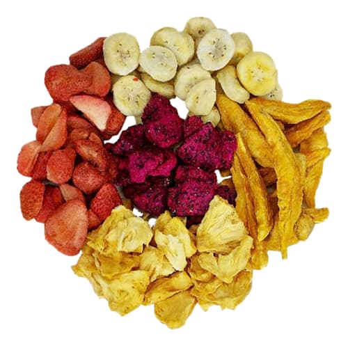 Trái cây sấy giòn gồm các loại dâu tây, chuối, xoài, thanh long và thơm, được sấy ở dạng cắt miếng tiện lợi, giữ nguyên màu sắc và hương thơm tự nhiên đặc trưng của từng loại quả. Trái cây sau khi thu hoạch được xử lý vệ sinh kỹ lưỡng, loại bỏ tạp chất, rồi đưa vào quy trình sấy thăng hoa tiên tiến, giúp sản phẩm giòn rụm mà vẫn bảo toàn tối đa dưỡng chất.